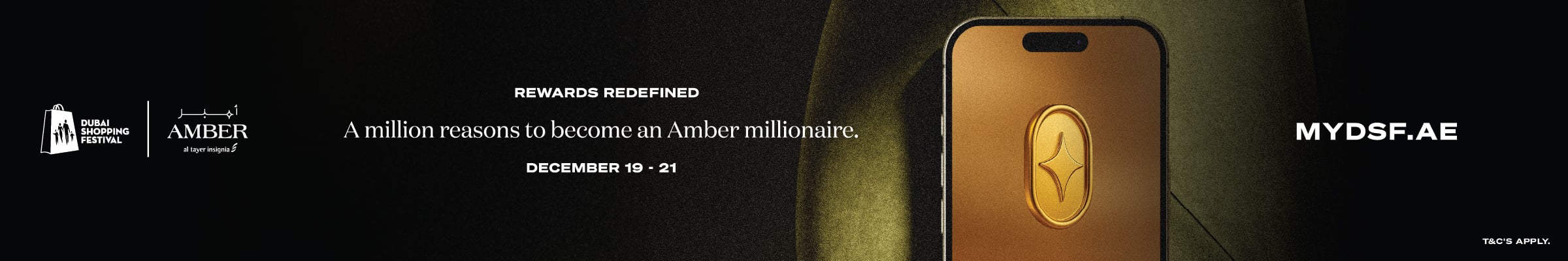 Spend AED 500 from 19-21 December for a chance to win 1 million Amber points. Plus earn 5X* points on your purchase. Discover more from 19 to 21 December, Amber Rewards and Dubai Shopping Festival give you the chance to enter the Amber Millionaire draw, where ten winners will each receive 1 million Amber points worth AED 10,000. Make a single qualifying purchase of AED 500 or more on full-priced items to enter and earn a one-time bonus of 5X* Amber points. Ensure your Amber account is active and linked at checkout.
